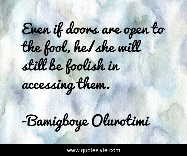 This page presents the quote "Even if doors are open to the fool, he/she will still be foolish in accessing them.". Author of this quote is Bamigboye Olurotimi. This quote is about fool, foolishness-access, accessing, foolish, open, blessing, life, favour, open-door,.