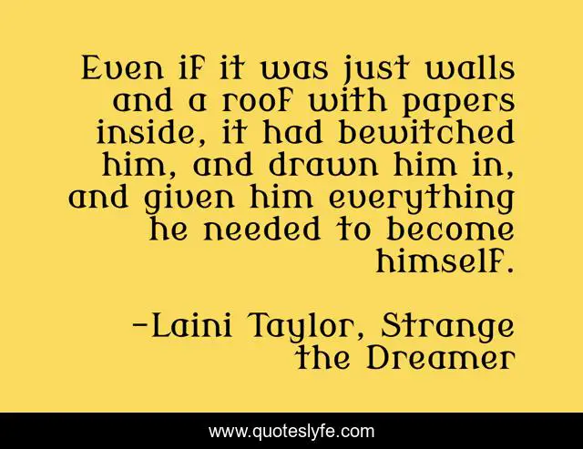 This page presents the quote "Even if it was just walls and a roof with papers inside, it had bewitched him, and drawn him in, and given him everything he needed to become himself.". Author of this quote is Laini Taylor, Strange the Dreamer. This quote is about life, books, help,.