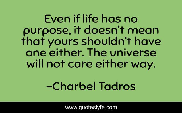 This page presents the quote "Even if life has no purpose, it doesn’t mean that yours shouldn’t have one either. The universe will not care either way.". Author of this quote is Charbel Tadros. This quote is about universe, life, purpose-of-life, purpose,.