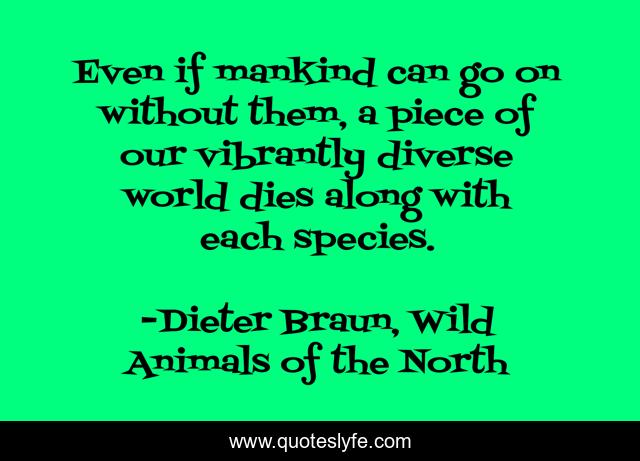 This page presents the quote "Even if mankind can go on without them, a piece of our vibrantly diverse world dies along with each species.". Author of this quote is Dieter Braun, Wild Animals of the North. This quote is about humanity, conservation, animals, animal-rights, nature,.