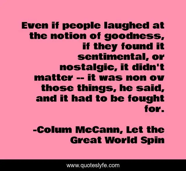 This page presents the quote "Even if people laughed at the notion of goodness, if they found it sentimental, or nostalgic, it didn't matter -- it was non ov those things, he said, and it had to be fought for.". Author of this quote is Colum McCann, Let the Great World Spin. .