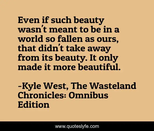 "Kyle West, The Wasteland Chronicles: Omnibus Edition Quotes." Quoteslyfe.com, 2025. Sun. 07 Dec. 2025. <https://www.quoteslyfe.com/quote/Even-if-such-beauty-wasn-t-meant-42520>.