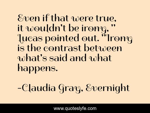 This page presents the quote "Even if that were true, it wouldn't be irony, " Lucas pointed out. "Irony is the contrast between what's said and what happens.". Author of this quote is Claudia Gray, Evernight. .