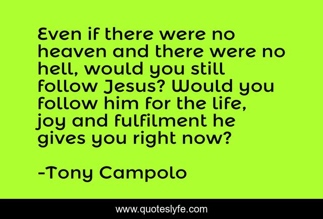 This page presents the quote "Even if there were no heaven and there were no hell, would you still follow Jesus? Would you follow him for the life, joy and fulfilment he gives you right now?". Author of this quote is Tony Campolo. This quote is about hell, heaven, follow-jesus, today,.