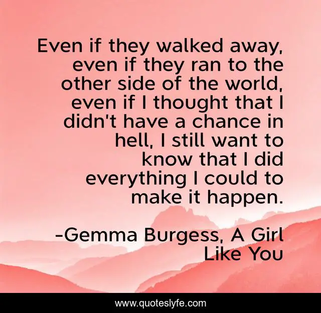 This page presents the quote "Even if they walked away, even if they ran to the other side of the world, even if I thought that I didn’t have a chance in hell, I still want to know that I did everything I could to make it happen.". Author of this quote is Gemma Burgess, A Girl Like You. This quote is about pursue, sweet, love, affection,.