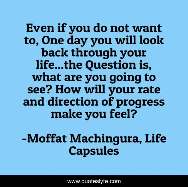 This page presents the quote "Even if you do not want to, One day you will look back through your life...the Question is, what are you going to see? How will your rate and direction of progress make you feel?". Author of this quote is Moffat Machingura, Life Capsules. This quote is about direction, midlife, life, past, life-lessons, progress, look-back, life-and-living, crisis,.