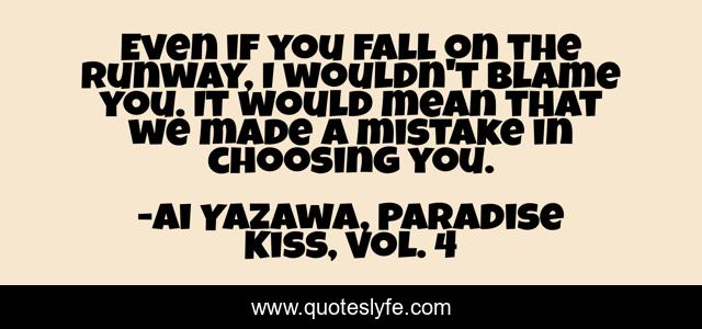 This page presents the quote "Even if you fall on the runway, I wouldn't blame you. It would mean that we made a mistake in choosing you.". Author of this quote is Ai Yazawa, Paradise Kiss, Vol. 4. This quote is about romance, fashion, yukari, george,.