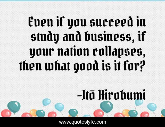 This page presents the quote "Even if you succeed in study and business, if your nation collapses, then what good is it for?". Author of this quote is Itō Hirobumi. This quote is about politics, nation, patriotism, inspirational, enthusiasm,.