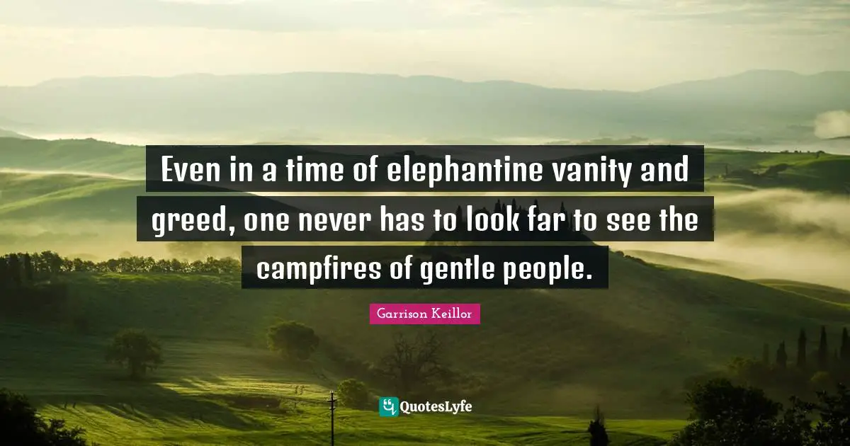 This page presents the quote "Even in a time of elephantine vanity and greed, one never has to look far to see the campfires of gentle people.". Author of this quote is Garrison Keillor. This quote is about time, people, gentle, greed, vanity,.