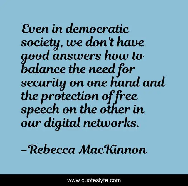 This page presents the quote "Even in democratic society, we don't have good answers how to balance the need for security on one hand and the protection of free speech on the other in our digital networks.". Author of this quote is Rebecca MacKinnon. This quote is about good, balance, free,.