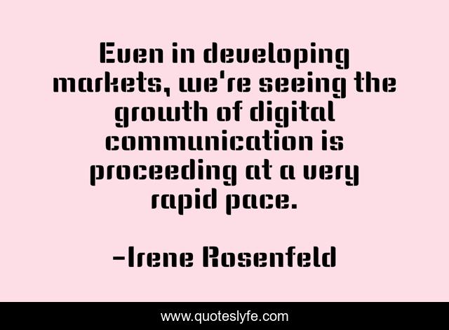 This page presents the quote "Even in developing markets, we're seeing the growth of digital communication is proceeding at a very rapid pace.". Author of this quote is Irene Rosenfeld. This quote is about seeing, growth, digital,.