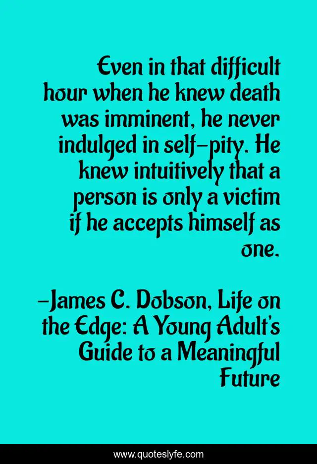 This page presents the quote "Even in that difficult hour when he knew death was imminent, he never indulged in self-pity. He knew intuitively that a person is only a victim if he accepts himself as one.". Author of this quote is James C. Dobson, Life on the Edge: A Young Adult's Guide to a Meaningful Future. This quote is about self-pity, himself, hour, intuitively, imminent, knew, accepts, one, person,.