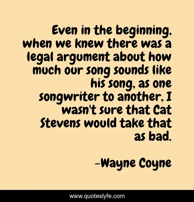 This page presents the quote "Even in the beginning, when we knew there was a legal argument about how much our song sounds like his song, as one songwriter to another, I wasn't sure that Cat Stevens would take that as bad.". Author of this quote is Wayne Coyne. This quote is about beginning, argument, song,.