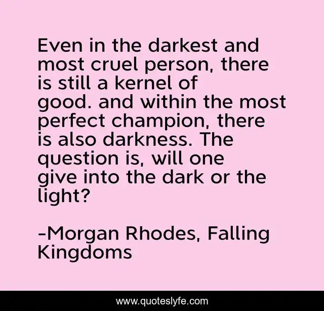 This page presents the quote "Even in the darkest and most cruel person, there is still a kernel of good. and within the most perfect champion, there is also darkness. The question is, will one give into the dark or the light?". Author of this quote is Morgan Rhodes, Falling Kingdoms. .