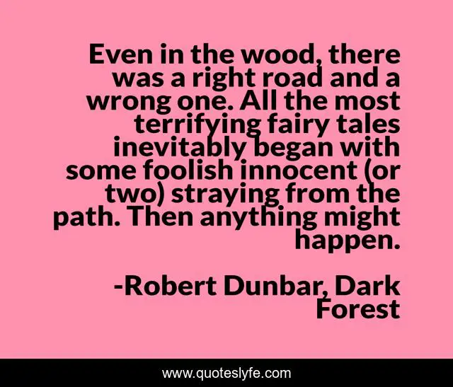 This page presents the quote "Even in the wood, there was a right road and a wrong one. All the most terrifying fairy tales inevitably began with some foolish innocent (or two) straying from the path. Then anything might happen.". Author of this quote is Robert Dunbar, Dark Forest. This quote is about myths, haunted-places, fairy-tales,.