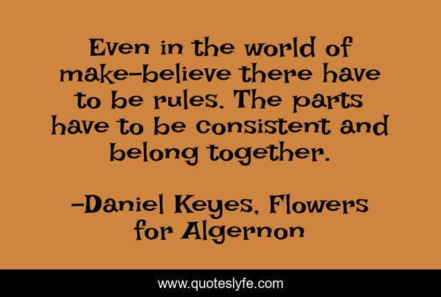 This page presents the quote "Even in the world of make-believe there have to be rules. The parts have to be consistent and belong together.". Author of this quote is Daniel Keyes, Flowers for Algernon. This quote is about on-fiction, fiction,.