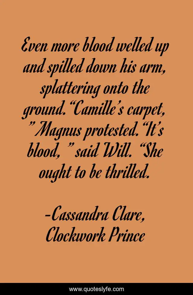 This page presents the quote "Even more blood welled up and spilled down his arm, splattering onto the ground.“Camille’s carpet, ” Magnus protested.“It’s blood, ” said Will. “She ought to be thrilled.". Author of this quote is Cassandra Clare, Clockwork Prince. This quote is about magnus-bane, will-herondale, humor, blood, camille-belcourt,.