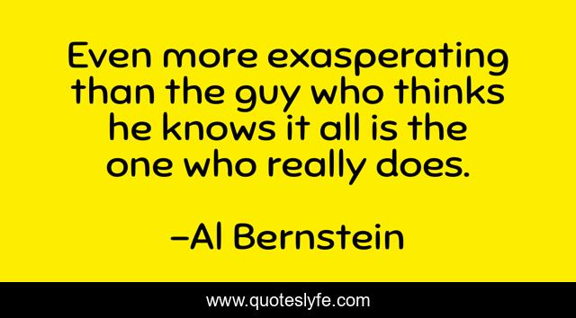This page presents the quote "Even more exasperating than the guy who thinks he knows it all is the one who really does.". Author of this quote is Al Bernstein. This quote is about introductions, openers,.