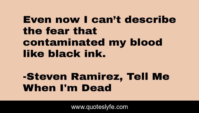 This page presents the quote "Even now I can’t describe the fear that contaminated my blood like black ink.". Author of this quote is Steven Ramirez, Tell Me When I'm Dead. This quote is about drunk, novel, dead, zombie-thriller, soldiers, paranormal-thriller, horde, na, hordes,.