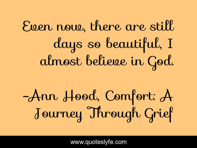 This page presents the quote "Even now, there are still days so beautiful, I almost believe in God.". Author of this quote is Ann Hood, Comfort: A Journey Through Grief. This quote is about faith, belief, beauty, god, atheism, agnosticism,.
