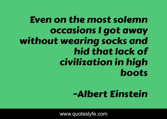 This page presents the quote "Even on the most solemn occasions I got away without wearing socks and hid that lack of civilization in high boots". Author of this quote is Albert Einstein. This quote is about fashion, humor,.