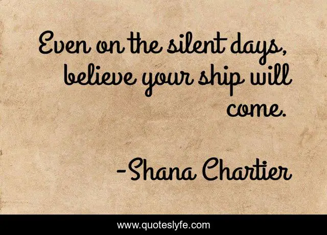 This page presents the quote "Even on the silent days, believe your ship will come.". Author of this quote is Shana Chartier. This quote is about love, inspire, author, joy, writer, authors-on-writing, writers, happiness, inspirational,.