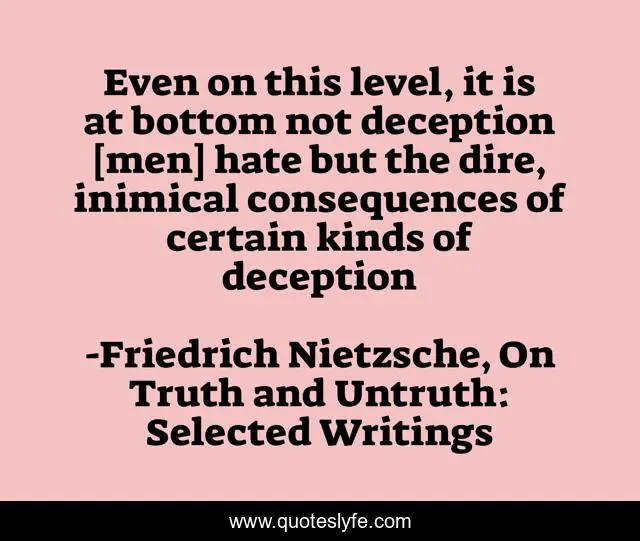 This page presents the quote "Even on this level, it is at bottom not deception [men] hate but the dire, inimical consequences of certain kinds of deception". Author of this quote is Friedrich Nietzsche, On Truth and Untruth: Selected Writings. This quote is about thought-provoking, insightful,.