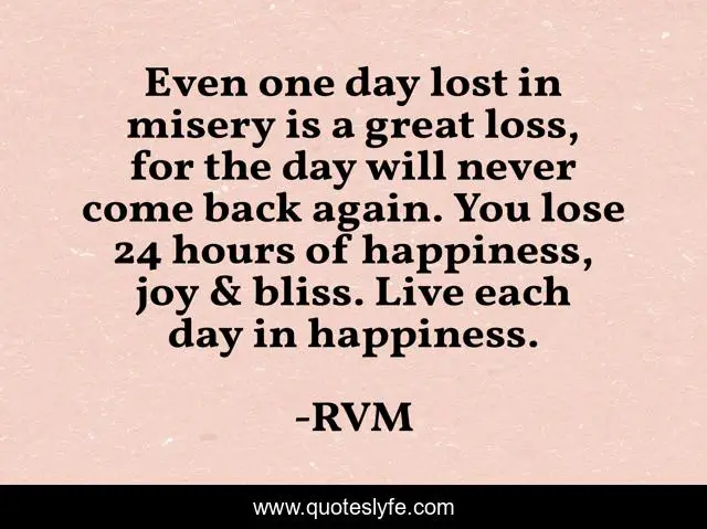 This page presents the quote "Even one day lost in misery is a great loss, for the day will never come back again. You lose 24 hours of happiness, joy & bliss. Live each day in happiness.". Author of this quote is RVM. This quote is about motivation, inspiration,.