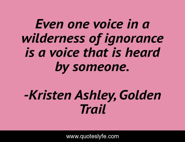 This page presents the quote "Even one voice in a wilderness of ignorance is a voice that is heard by someone.". Author of this quote is Kristen Ashley, Golden Trail. This quote is about life-lessons, knowledge, truth, power, ignorance,.
