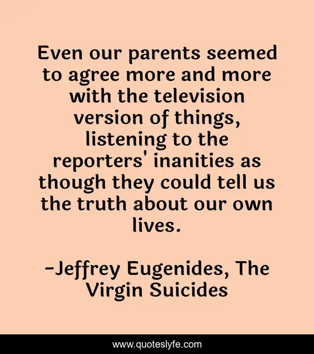 This page presents the quote "Even our parents seemed to agree more and more with the television version of things, listening to the reporters' inanities as though they could tell us the truth about our own lives.". Author of this quote is Jeffrey Eugenides, The Virgin Suicides. This quote is about life, philosophical, the-virgin-suicides,.