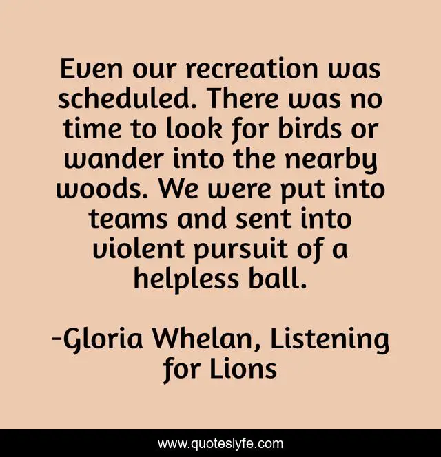 This page presents the quote "Even our recreation was scheduled. There was no time to look for birds or wander into the nearby woods. We were put into teams and sent into violent pursuit of a helpless ball.". Author of this quote is Gloria Whelan, Listening for Lions. This quote is about recreation, ball, play, sports, imagination, organized-sports, teams,.