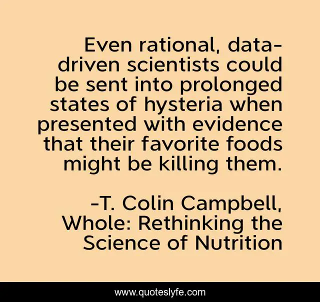 This page presents the quote "Even rational, data-driven scientists could be sent into prolonged states of hysteria when presented with evidence that their favorite foods might be killing them.". Author of this quote is T. Colin Campbell, Whole: Rethinking the Science of Nutrition. This quote is about nutrition, health,.