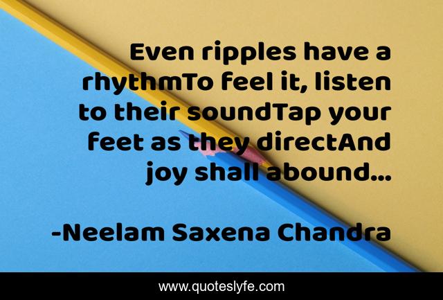 This page presents the quote "Even ripples have a rhythmTo feel it, listen to their soundTap your feet as they directAnd joy shall abound…". Author of this quote is Neelam Saxena Chandra. This quote is about joy, ripples,.