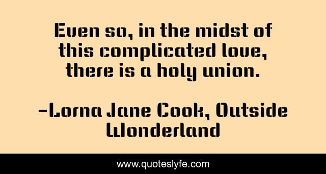 This page presents the quote "Even so, in the midst of this complicated love, there is a holy union.". Author of this quote is Lorna Jane Cook, Outside Wonderland. This quote is about complicated-love, union, love, affection,.