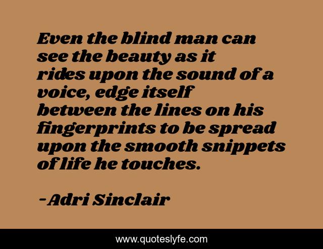 This page presents the quote "Even the blind man can see the beauty as it rides upon the sound of a voice, edge itself between the lines on his fingerprints to be spread upon the smooth snippets of life he touches.". Author of this quote is Adri Sinclair. This quote is about beautiful, enthusiasm, inspirational, positive-outlook,.