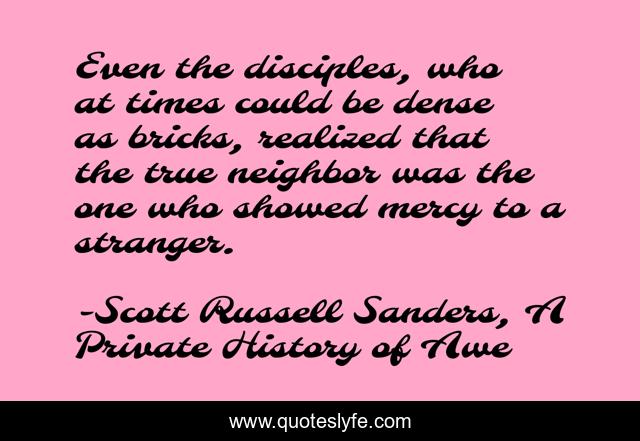 This page presents the quote "Even the disciples, who at times could be dense as bricks, realized that the true neighbor was the one who showed mercy to a stranger.". Author of this quote is Scott Russell Sanders, A Private History of Awe. This quote is about mercy, neighbor,.