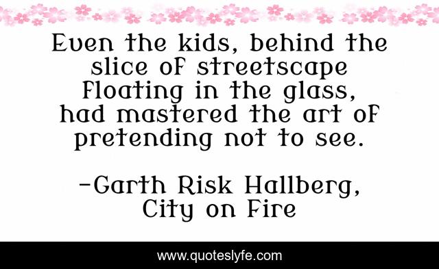 This page presents the quote "Even the kids, behind the slice of streetscape floating in the glass, had mastered the art of pretending not to see.". Author of this quote is Garth Risk Hallberg, City on Fire. This quote is about city-on-fire, kids, description, garth-risk-hallberg,.