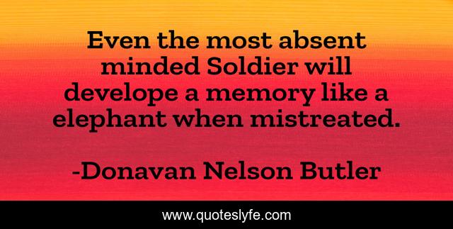 This page presents the quote "Even the most absent minded Soldier will develope a memory like a elephant when mistreated.". Author of this quote is Donavan Nelson Butler. This quote is about military, equlaity, leadership,.