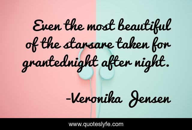 This page presents the quote "Even the most beautiful of the starsare taken for grantednight after night.". Author of this quote is Veronika Jensen. This quote is about broken-heart, granted, love, stars, affection,.
