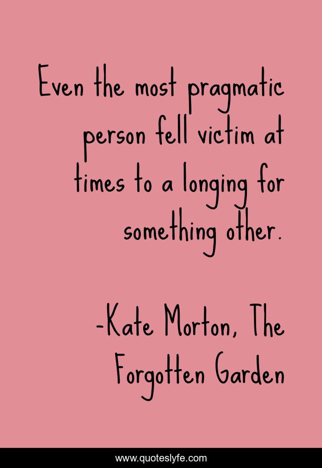 This page presents the quote "Even the most pragmatic person fell victim at times to a longing for something other.". Author of this quote is Kate Morton, The Forgotten Garden. This quote is about pragmatism, desires,.
