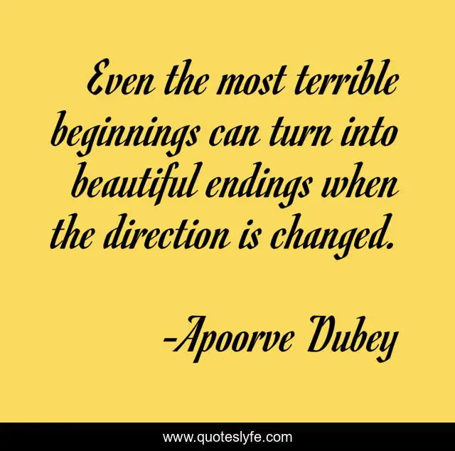 This page presents the quote "Even the most terrible beginnings can turn into beautiful endings when the direction is changed.". Author of this quote is Apoorve Dubey. This quote is about behaviour, enthusiasm, attitude, quote-on-life, inspirational,.