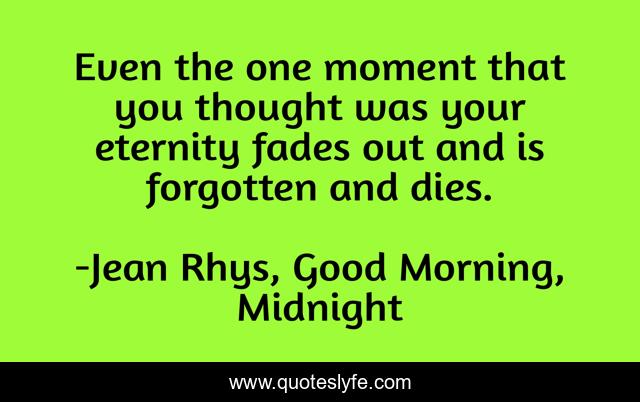 This page presents the quote "Even the one moment that you thought was your eternity fades out and is forgotten and dies.". Author of this quote is Jean Rhys, Good Morning, Midnight. This quote is about eternity, dies, moment, fades, forgotten,.