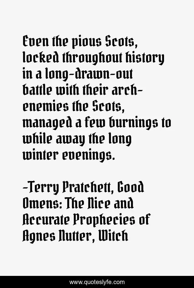 "Terry Pratchett, Good Omens: The Nice and Accurate Prophecies of Agnes Nutter, Witch Quotes." Quoteslyfe.com, 2025. Fri. 05 Dec. 2025. <https://www.quoteslyfe.com/quote/Even-the-pious-Scots-locked-throughout-history-233902>.