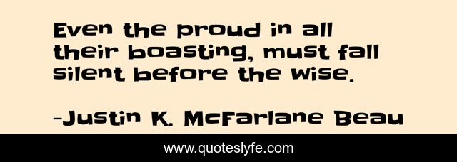 This page presents the quote "Even the proud in all their boasting, must fall silent before the wise.". Author of this quote is Justin K. McFarlane Beau. This quote is about wise, boasting, all-knowing, proud, reverence, omniscient, respect, silence,.