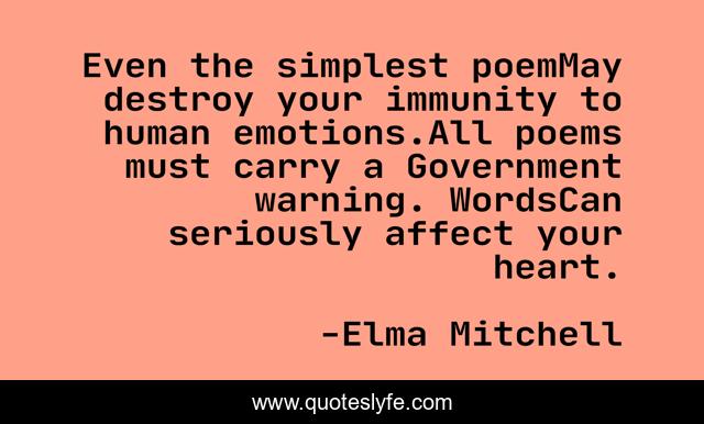 This page presents the quote "Even the simplest poemMay destroy your immunity to human emotions.All poems must carry a Government warning. WordsCan seriously affect your heart.". Author of this quote is Elma Mitchell. .