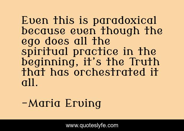 This page presents the quote "Even this is paradoxical because even though the ego does all the spiritual practice in the beginning, it’s the Truth that has orchestrated it all.". Author of this quote is Maria Erving. This quote is about ego, awakening, enlightenment, spiritual-awakening, consciousness,.