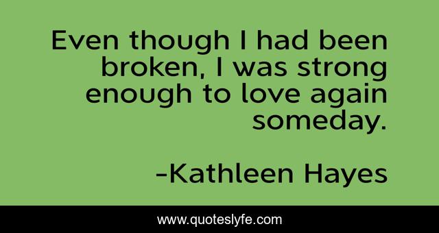 This page presents the quote "Even though I had been broken, I was strong enough to love again someday.". Author of this quote is Kathleen Hayes. This quote is about m-m-romance, broken, love, affection,.