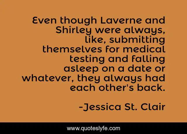 This page presents the quote "Even though Laverne and Shirley were always, like, submitting themselves for medical testing and falling asleep on a date or whatever, they always had each other's back.". Author of this quote is Jessica St. Clair. This quote is about falling, testing, back,.