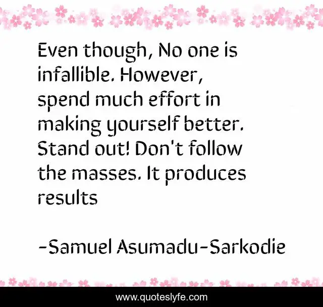 This page presents the quote "Even though, No one is infallible. However, spend much effort in making yourself better. Stand out! Don't follow the masses. It produces results". Author of this quote is Samuel Asumadu-Sarkodie. This quote is about proverbs, words-of-knowledge, discernment, parables, words-of-wisdom, inspirational-life,.