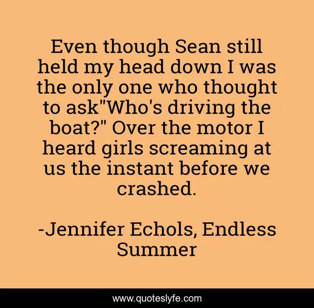 This page presents the quote "Even though Sean still held my head down I was the only one who thought to ask"Who's driving the boat?" Over the motor I heard girls screaming at us the instant before we crashed.". Author of this quote is Jennifer Echols, Endless Summer. This quote is about summer, romantic, endless-summer, jennifer, echols, jennifer-echols, boys-next-door, adam, the-boys-next-door,.